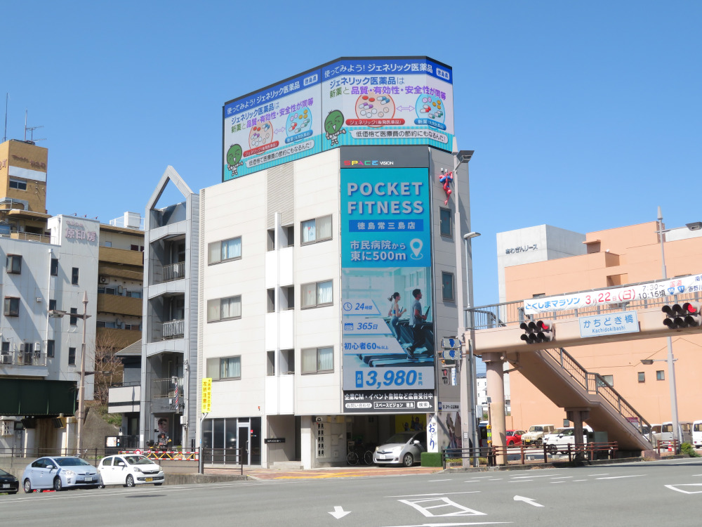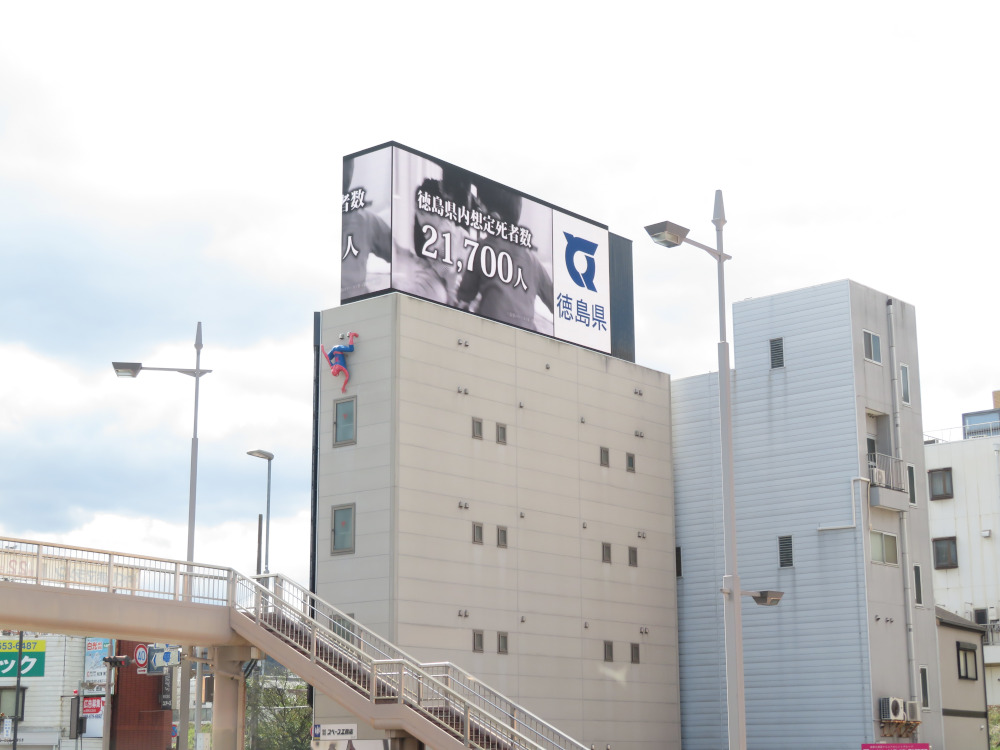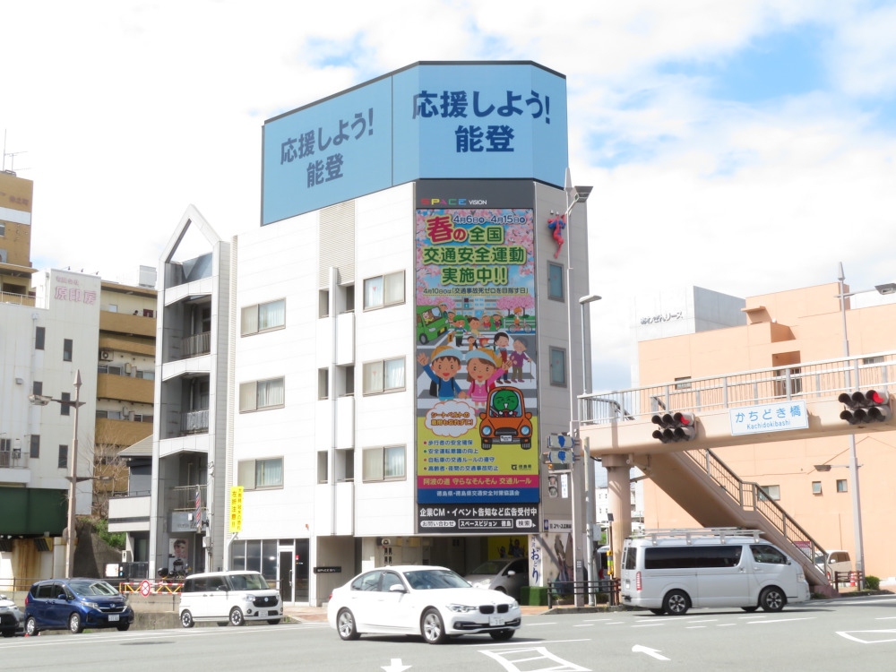 徳島市中心部に立地する県庁前交差点の自動車交通量は一日約6万台以上。信号待ちの時間も長く、まさに大型ビジョンの設置に最適な場所と言えるでしょう。