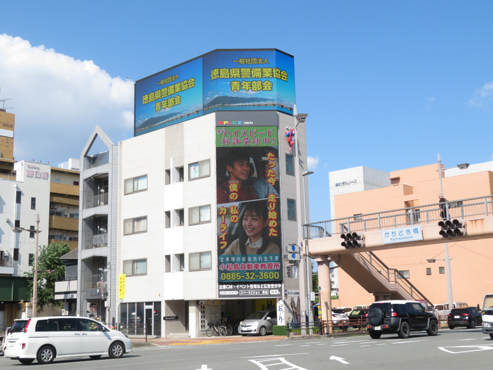 徳島市中心部に立地する県庁前交差点の自動車交通量は一日約6万台以上。信号待ちの時間も長く、まさに大型ビジョンの設置に最適な場所と言えるでしょう。