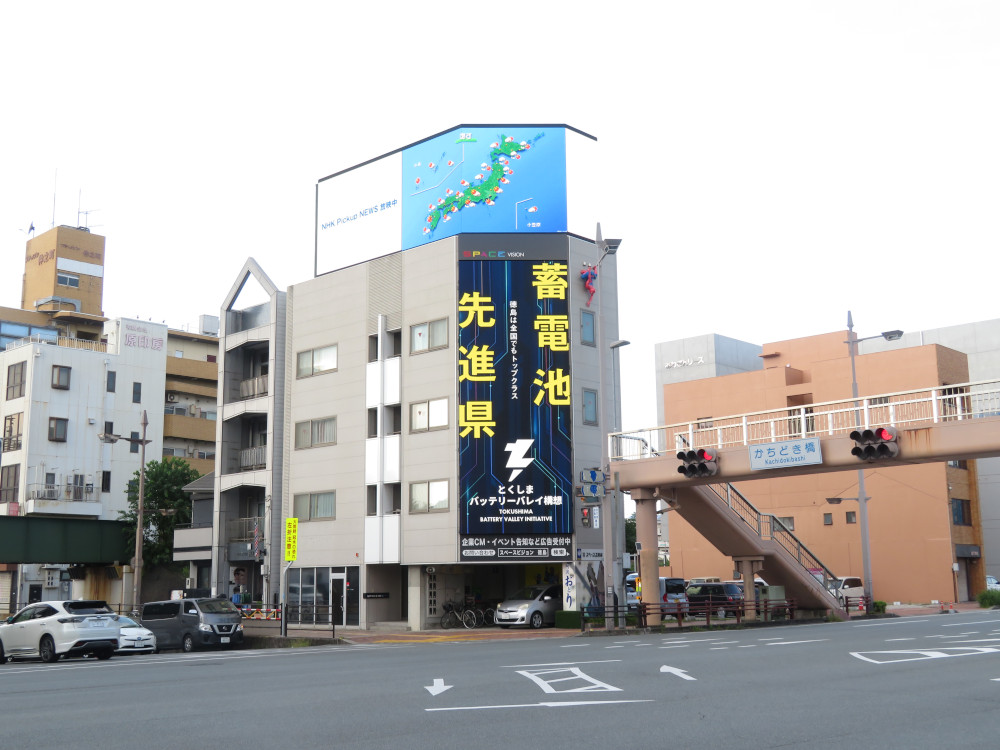 徳島市中心部に立地する県庁前交差点の自動車交通量は一日約6万台以上。信号待ちの時間も長く、まさに大型ビジョンの設置に最適な場所と言えるでしょう。