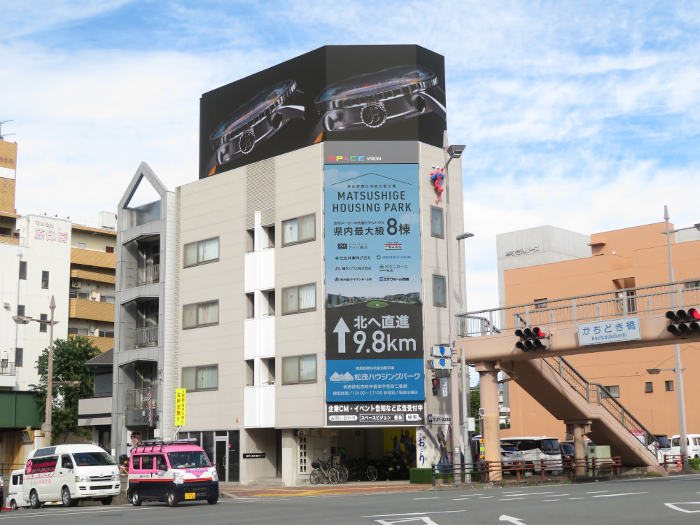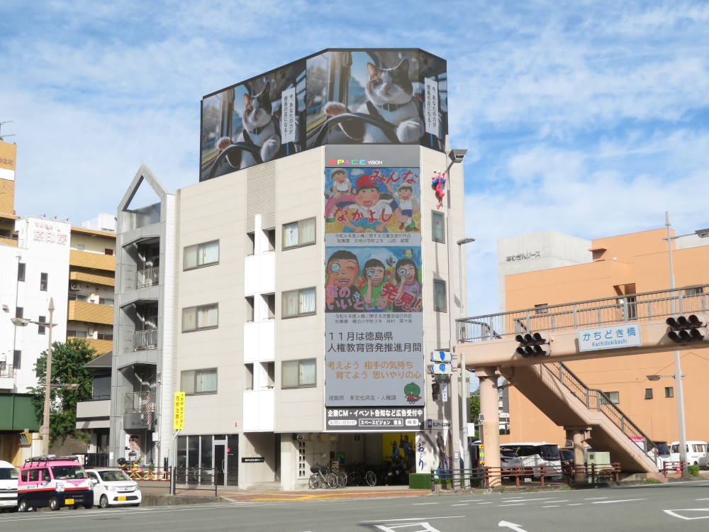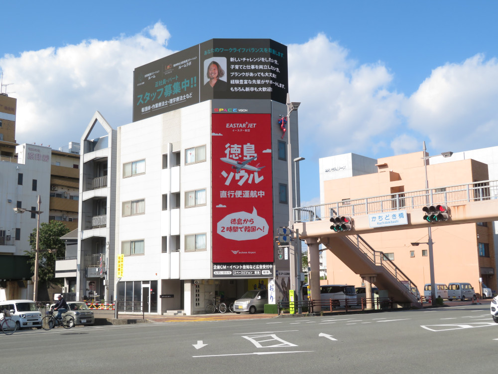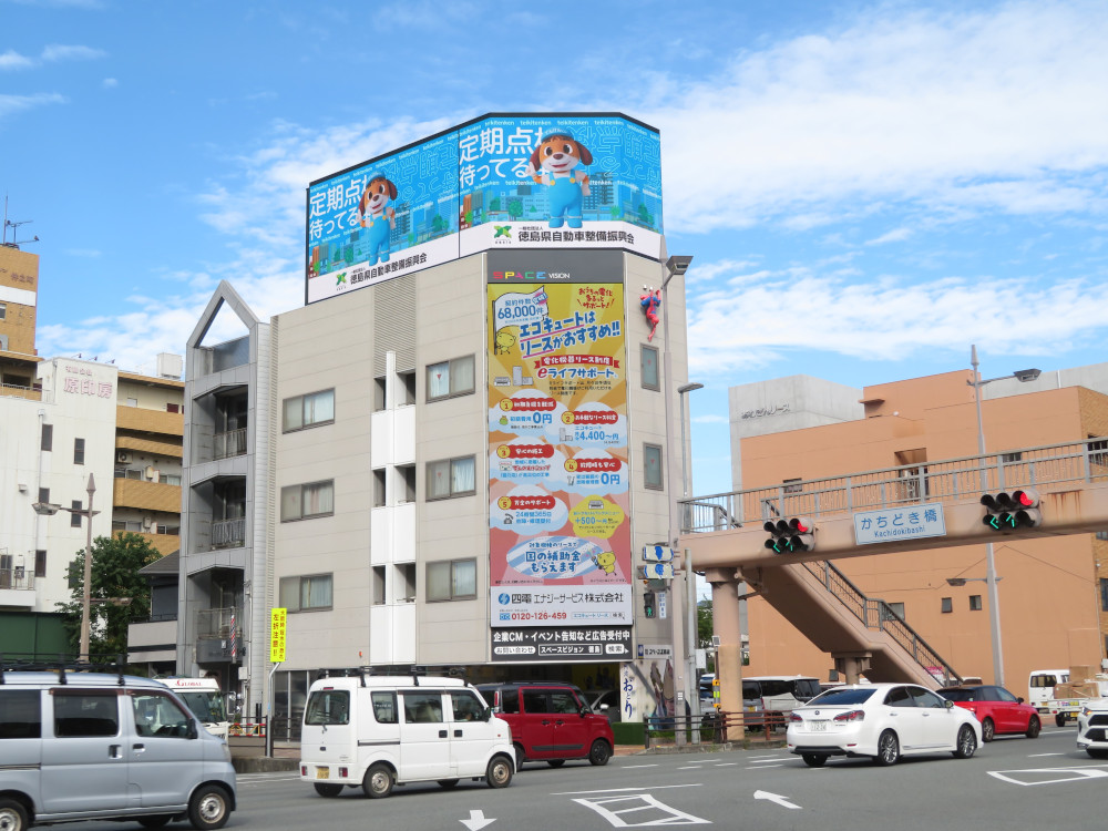 徳島市中心部に立地する県庁前交差点の自動車交通量は一日約6万台以上。信号待ちの時間も長く、まさに大型ビジョンの設置に最適な場所と言えるでしょう。