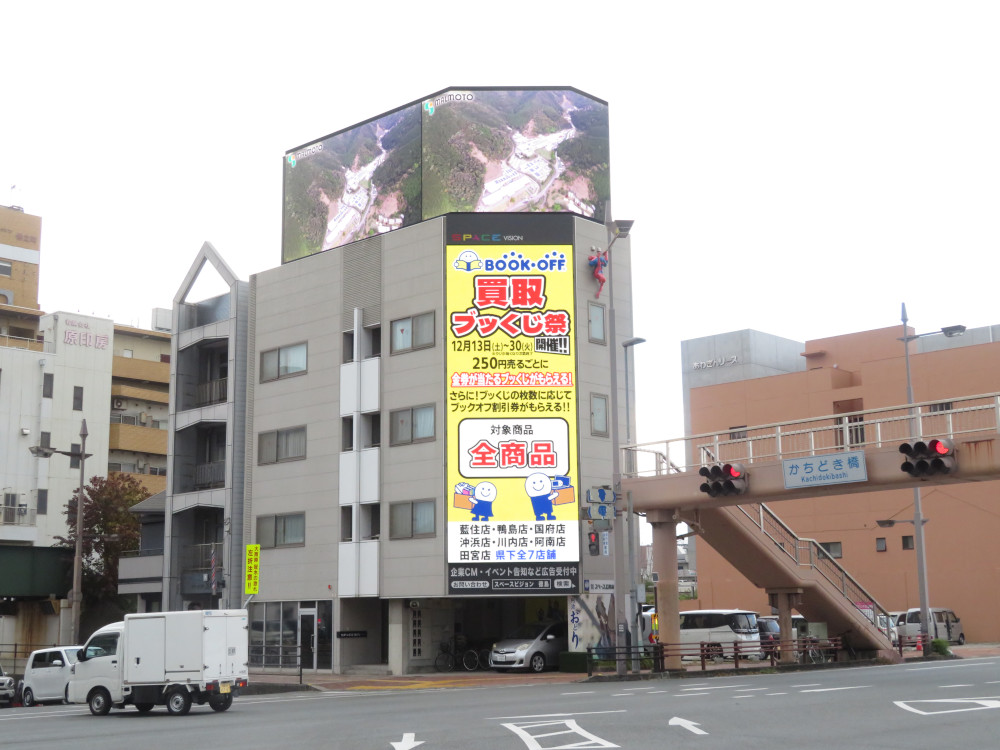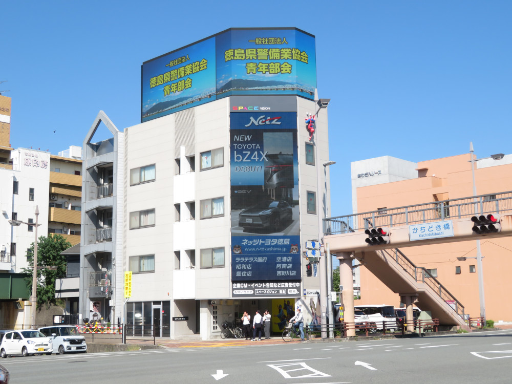 徳島市中心部に立地する県庁前交差点の自動車交通量は一日約6万台以上。信号待ちの時間も長く、まさに大型ビジョンの設置に最適な場所と言えるでしょう。